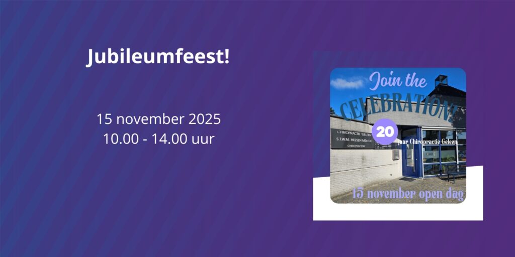 Wij bestaan 20 jaar en dat vieren we graag samen met jou! Kom langs op onze open dag en maak kennis met ons team, de verschillende disciplines en wat we allemaal doen voor jouw gezondheid en welzijn.